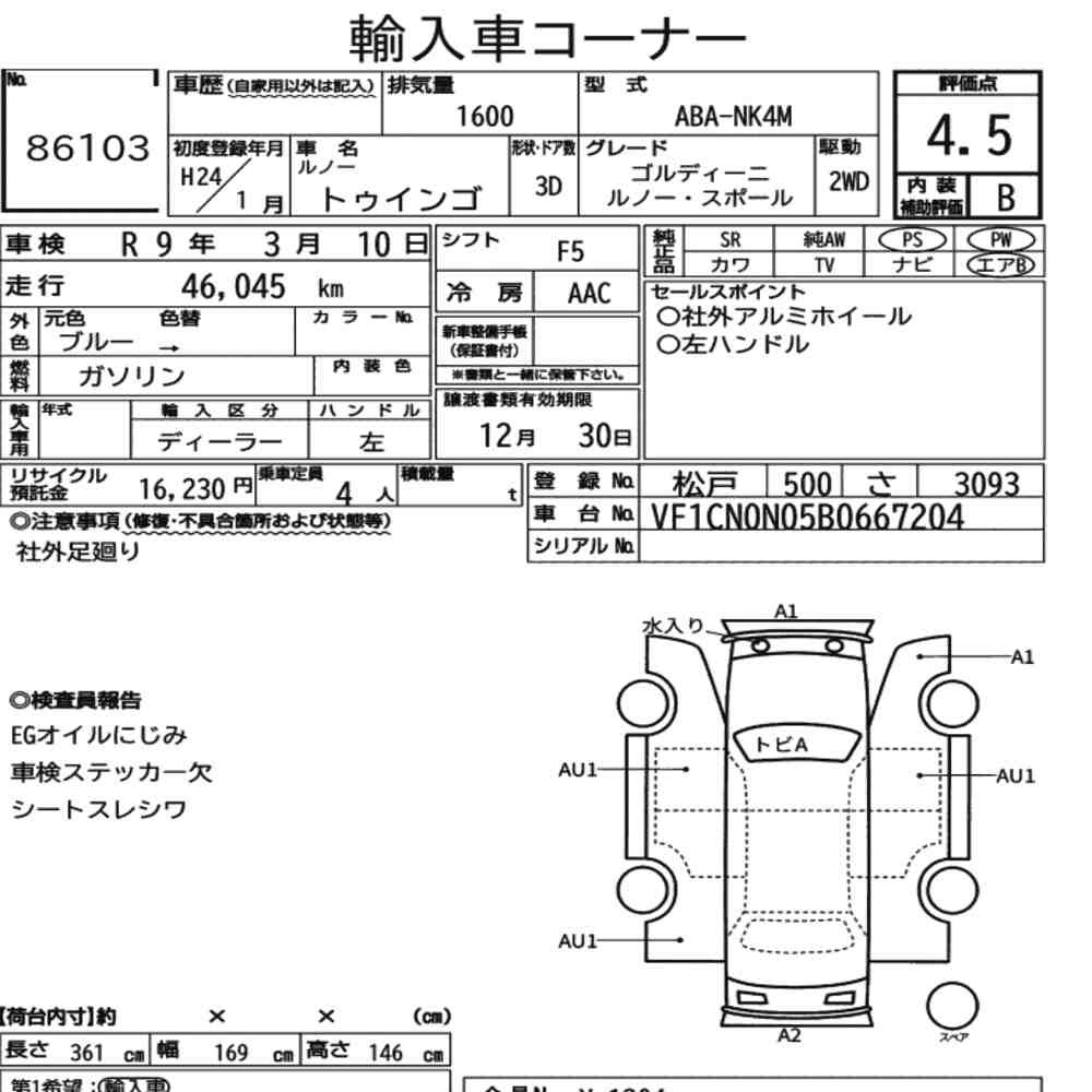 pa_mileage icon47.000pa_location iconYokohamapa_capacity icon1600lot icon86103pa_rank icon4.5pa_gearbox iconMT